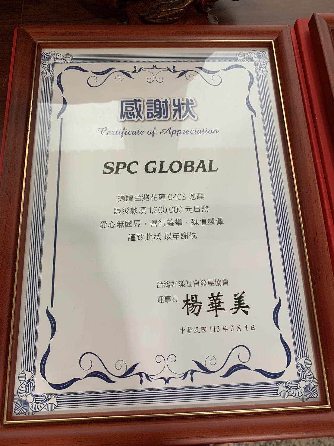 楊華美說,災後不久就輾轉得知SPC GLOBAL有意捐款給花蓮,並希望由她來安排後續事宜。因此她在上個月考察時,也特地與蔡依靜、林則葹議員親訪SPC GLOBAL東京總部致謝。她說日本與台灣同樣是地震頻繁的地區,長期以來民間自發性的互相支援,是患難真情。