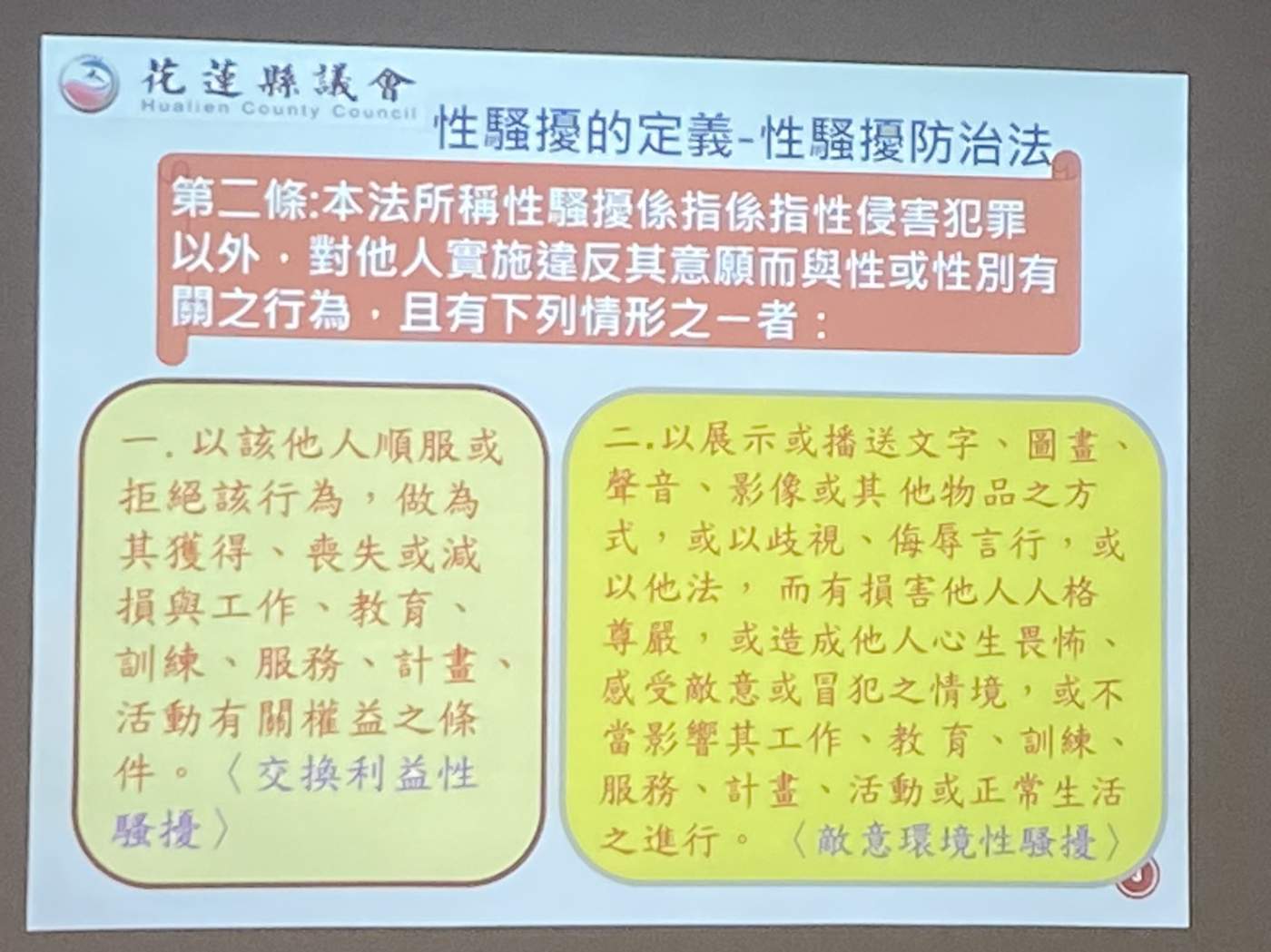 花蓮縣議會人事室針對性騷擾防治措施申訴及懲處要點進行說明,其重點內容︰一、提供本會員工及求職者免於性騷擾之工作環境,採取適當之預防、糾正、懲戒及處理措施,以維護當事人權益及隱私。二、利用集會、印刷品等各種傳遞訊息方式,加強員工有關性騷擾防治措施及申訴管道之宣導,並於各種公務人員訓練、講習課程中,規劃兩性平權及性騷擾防治相關課程。三、本會主管對於其所屬員工,或員工與員工相互間,不得有性意味或性別歧視之言詞或行為;主管對下屬,不可明示或暗示之性要求、具有性意味或性別歧視之言詞或行為,做為考績、陞遷、降調、獎懲等之交換條件。四、本會設置性騷擾申訴評議申評會以保密方式處理申訴。五、本會就性騷擾事件之申訴,設置專線電話、傳真、專用信箱或電子信箱。