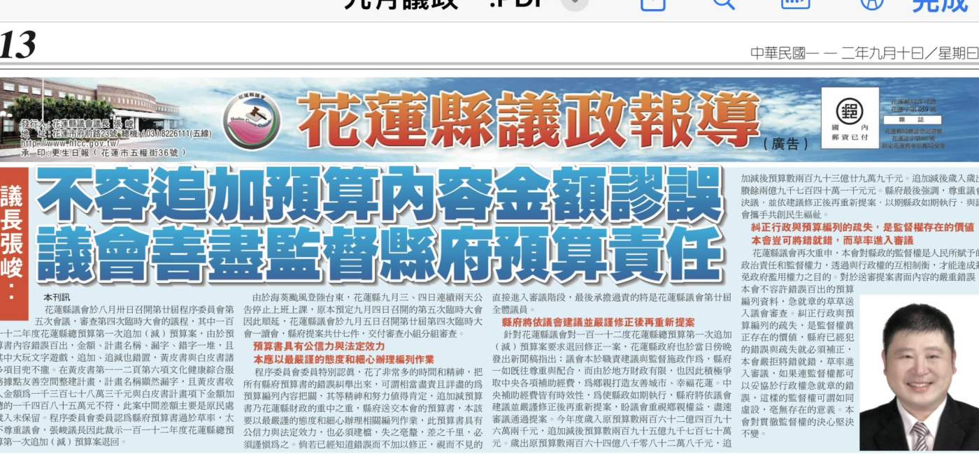 標題:不容縣府追加預算內容謬誤,議會善盡監督縣府預算之責
