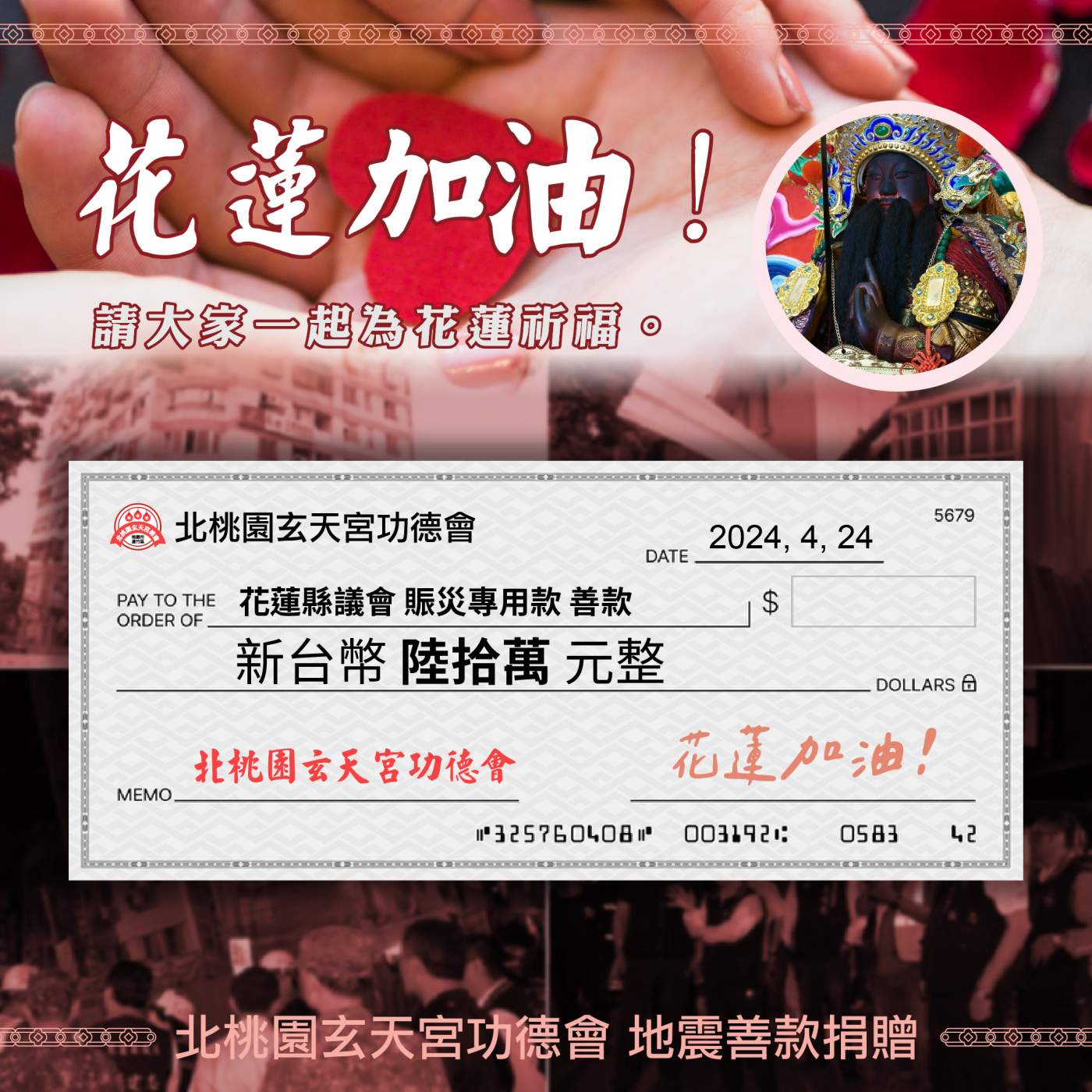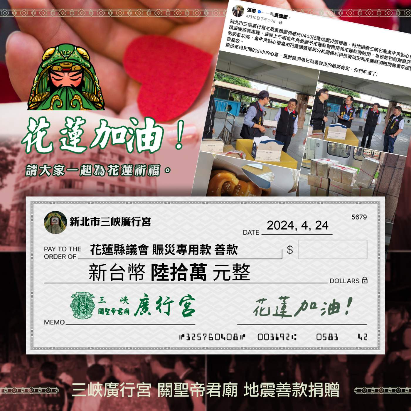 三峽廣行宮關聖帝君廟主委黃騰霆繼賑災之初,捐贈金牛角慰勉花蓮縣警消人員之後,4/24日再次結合北桃園玄天宮功德會創會長周國福、理事長鄭清火,共同發揮善心,捐助120萬元,請花蓮縣議會議長張峻繼續協助災民度過難關。