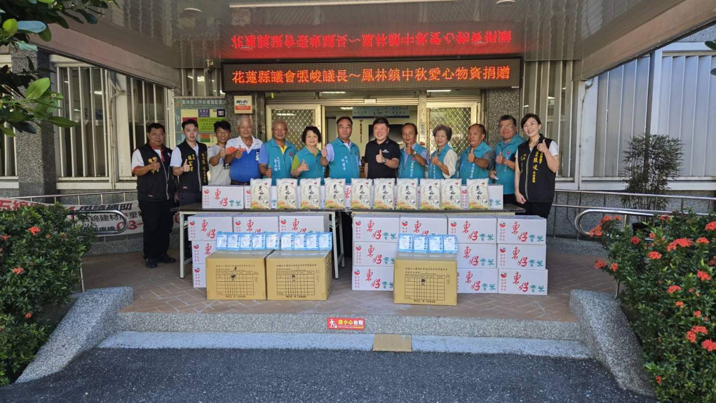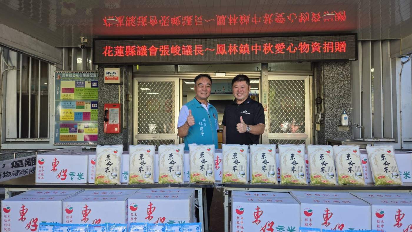 花蓮縣議會議長張峻9/10日上午帶著300包白米及1000組涼爽袖套抵達鳳林鎮公所,鳳林鎮長林建平偕同各里里長於鳳林鎮公所前廣場舉行簡單的物資點交儀式,林建平鎮長隨即邀請張峻議長和里長一起至鎮長室意見交流。緊接著12里里長便派員將物資運走,開始展開馬不停蹄的中秋關懷物資發送。