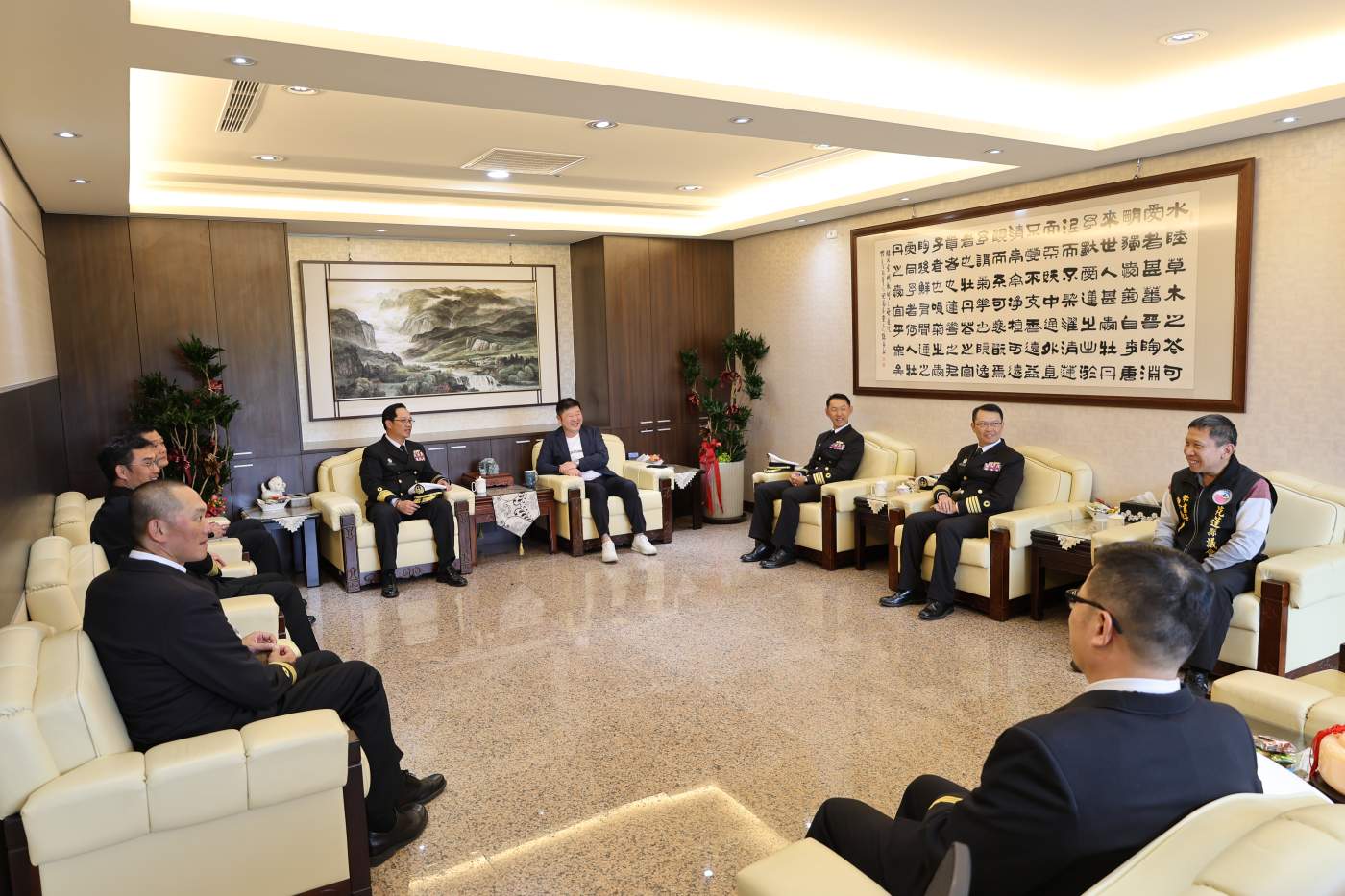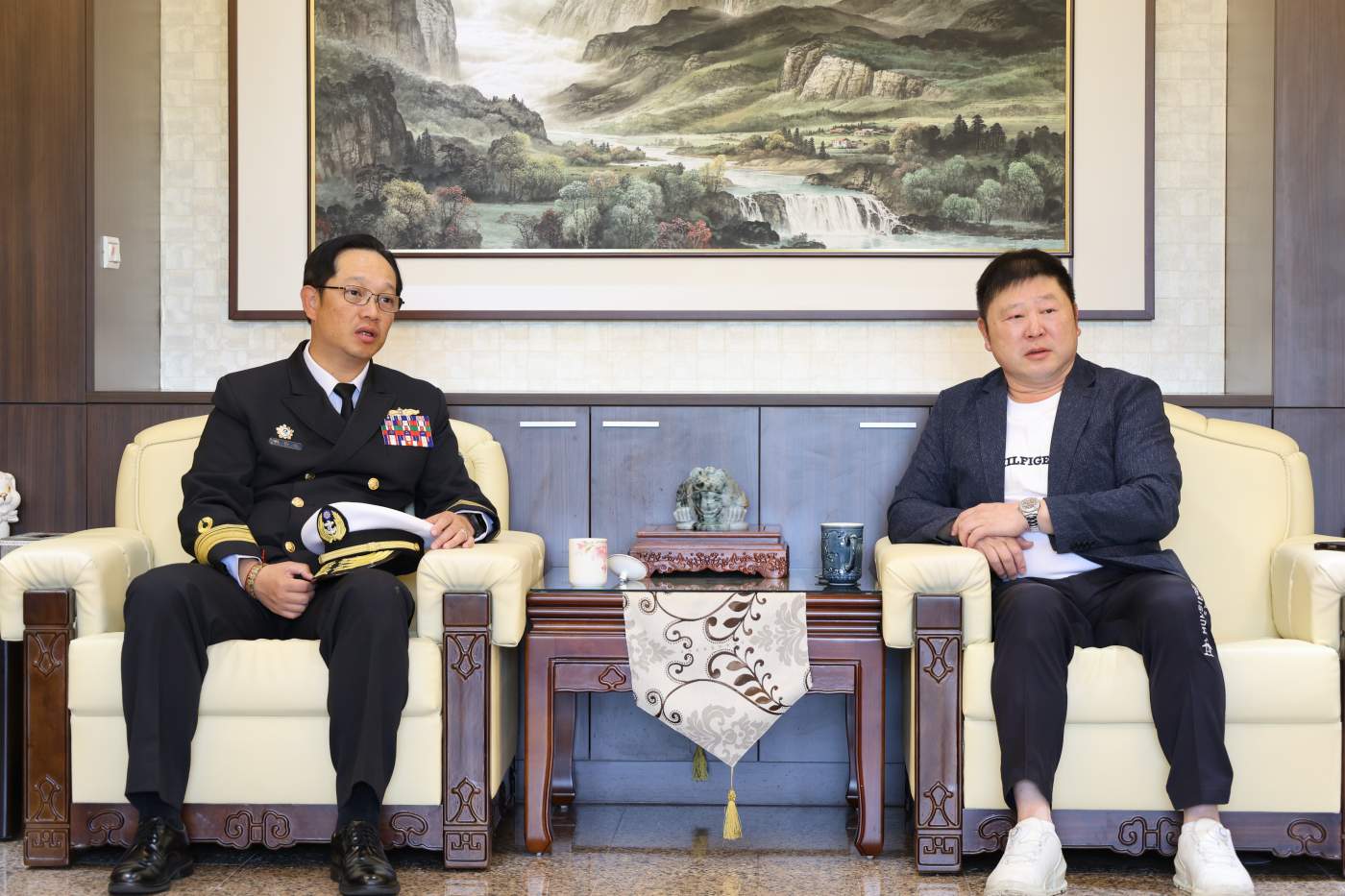3/21日下午,海軍敦睦遠航訓練支隊長劉岱瑞少將率領支隊政戰主任劉志建上校、磐石艦長林銘軒上校、武昌艦長王家倫上校、鄭和艦長鄭明忠上校及隨艦軍官拜會花蓮縣議會議長張峻,張議長特別慰勞200盒花蓮在地知名伴手禮—曾記麻糬,為海軍弟兄加油打氣,展現軍民一心。劉少將向張峻議長說明此行的任務目的,張峻議長也介紹自己義務役時為海軍,曾在艦艇上保家衛國,此話一出,立刻拉近彼此的距離,並劉少將等人於議長室相談甚歡,劉少將特別感謝花蓮鄉親和張峻議長對國軍的支持。