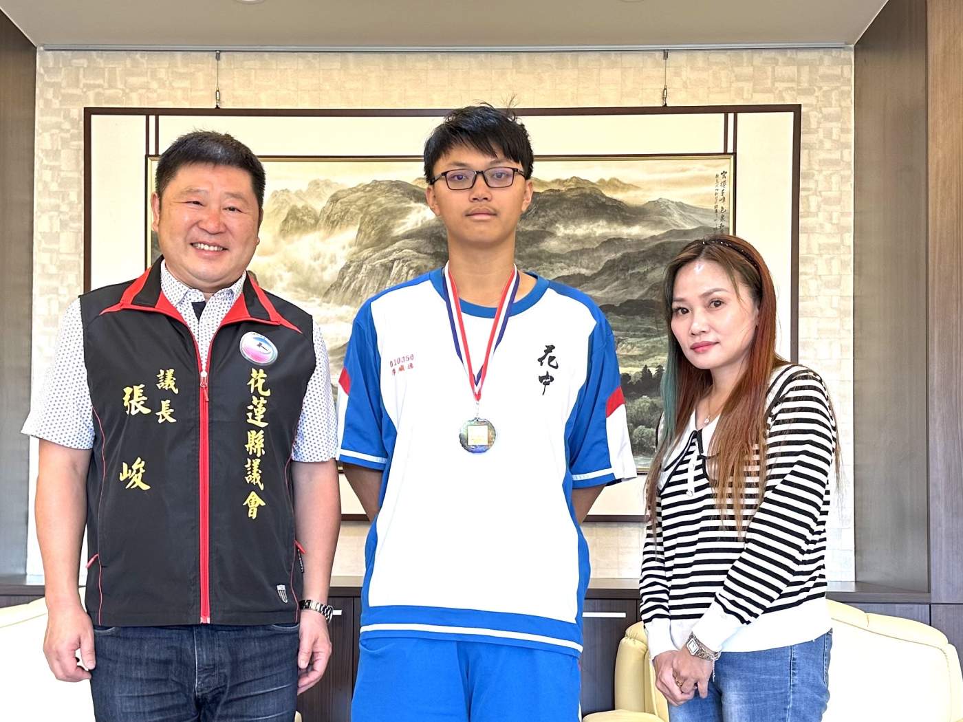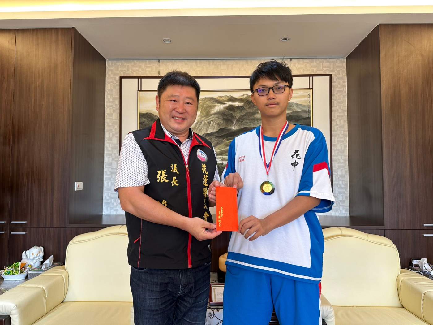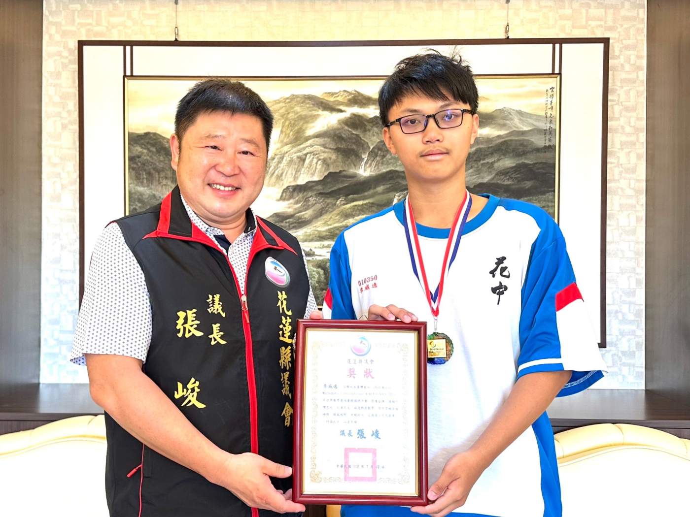 花蓮高中三年級李威逸同學7/17日代表臺灣到韓國參加「2023 World Mathematics Invitational KOREA FINALS 2023年世界數學邀請賽韓國總決賽」榮獲金牌,張峻議長聞訊後,特別於7/22日邀見李同學,並予以表揚。此次比賽有來自25個國家的學生參賽,李威逸同學勇奪金牌,堪稱台灣之光。