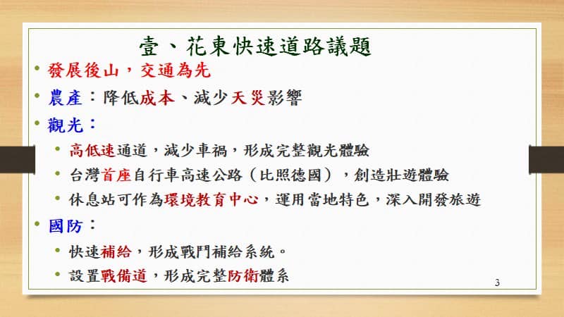 主張儘速動工的縣議員傅國淵說,有人質疑花東快速道路興建費用如此昂貴,就長遠計畫,花東快不僅建立台灣整個交通網連結重要一環外,也能夠做為飛機起降的戰備跑道,兼具國防和民生的價值,這條道路「遲早要做」,所以從長遠的角度跟計畫來看,中央政府一定要儘快完成這條「花東快速道路」。